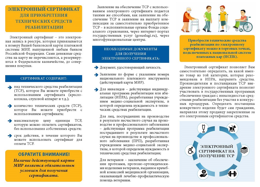 ФОНД СОЦИАЛЬНОГО СТРАХОВАНИЯ РОССИЙСКОЙ ФЕДЕРАЦИИ Государственное учреждение - Челябинское региональное отделение Фонда социального страхования Российской Федерации ул.Свободы, 153А, Челябинск, 454091 Тел. 265-85-57, Факс 265-85-27 23.12.2021 № 01-19/17-12701 На № от Председателю Комитета социальной Политики города Челябинска Администрации города Челябинска Л.Н. Мошковой Уважаемая Лариса Николаевна! Государственное учреждение – Челябинское региональное отделение Фонда социального страхования Российской Федерации в ответ на Ваше письмо от 17.12.2021г. № 03-4972 направляет информацию об электронном сертификате. В России разработан и постепенно запускается современный цифровой сервис – электронный сертификат на приобретение технических средств реабилитации (ФЗ № 491 от 30.12.2020 «О приобретении отдельных видов товаров, работ, услуг с использованием электронного сертификата») Электронный сертификат – это электронная запись в реестре, которая привязывается к номеру банковской карты платежной системы МИР, выпущенной любым банком РФ. На выданный электронный сертификат Фонд социального страхования Российской Федерации записывает определенную сумму, которую гражданин может потратить на приобретение ТСР, рекомендованных индивидуальной программой реабилитации/. При этом свои собственные средства он будет тратить только на то, чтобы оплатить разницу, если стоимость купленного ТСР превышает сумму сертификата. Электронный сертификат работает как банковская карта и позволяет мгновенно оплатить выбранный товар. При этом гражданин по-прежнему может выбрать - получить ТСР через ФСС, воспользоваться компенсацией за самостоятельно приобретенный товар или оформить электронный сертификат и оплатить им ТСР напрямую. На первом этапе электронный сертификат доступен только для отдельных видов ТСР серийного производства и поэтапно будет расширен, в том числе на ТСР индивидуального изготовления. Приложение: 3 файла в формате PDF. Заместитель управляющего В.В.Поздняков Исп. Ябс Е.Э. (351) 265-85-49